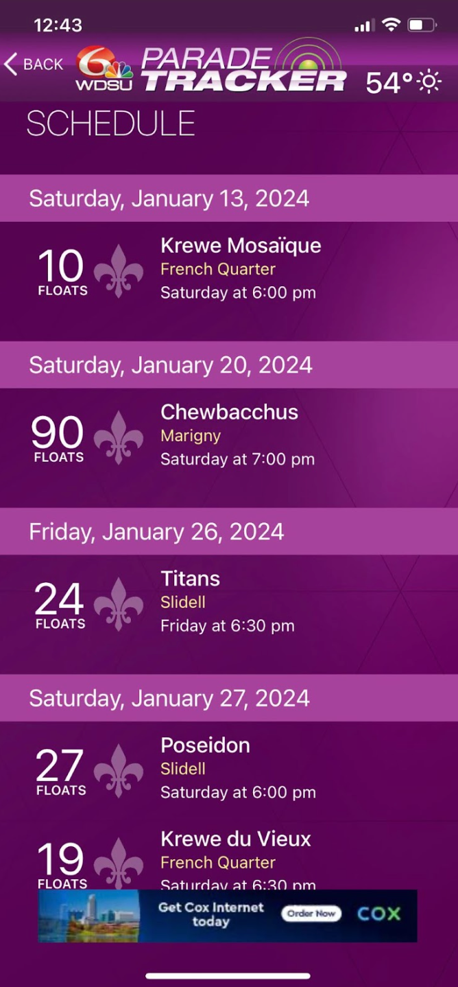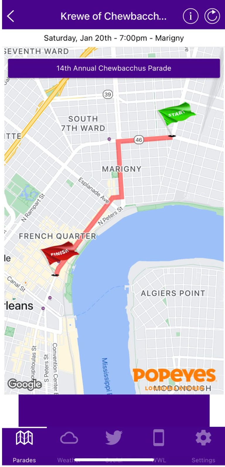 The WWL Mardi Gras Parade Tracker App is a solid option. Beyond parade routes and real time tracking information, it has some basic information on each parade, including the theme and number of floats. It also is sponsored by Popeyes and so it’ll always show you the closest Popeyes :)
