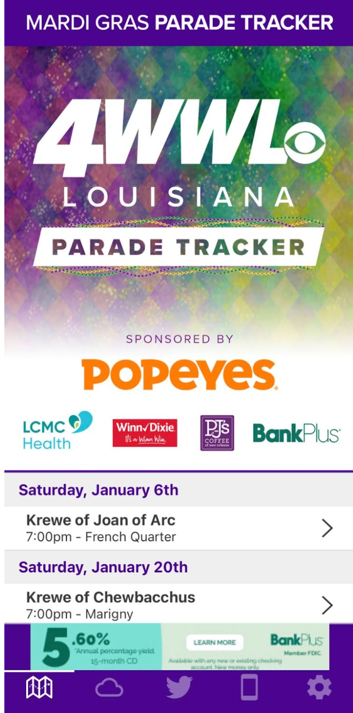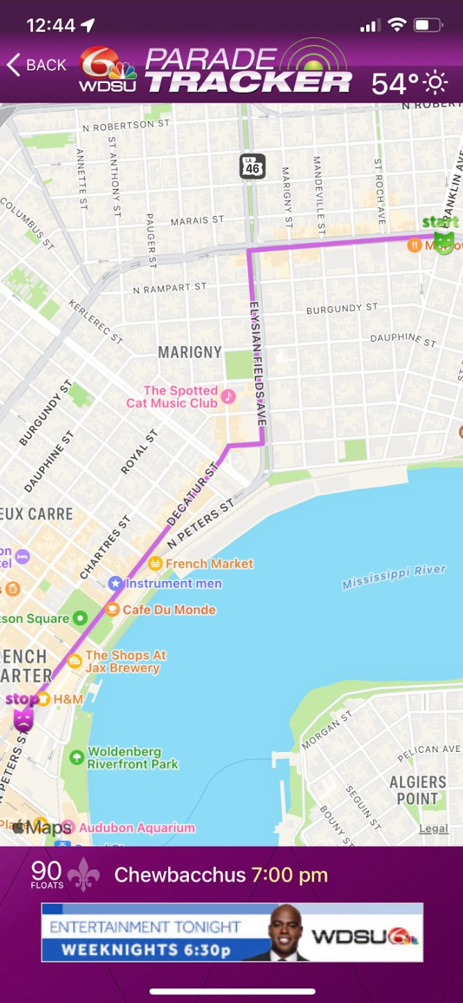There are two parade tracker apps: WWL Mardi Gras Parade Tracker and WDSU Parade Tracker